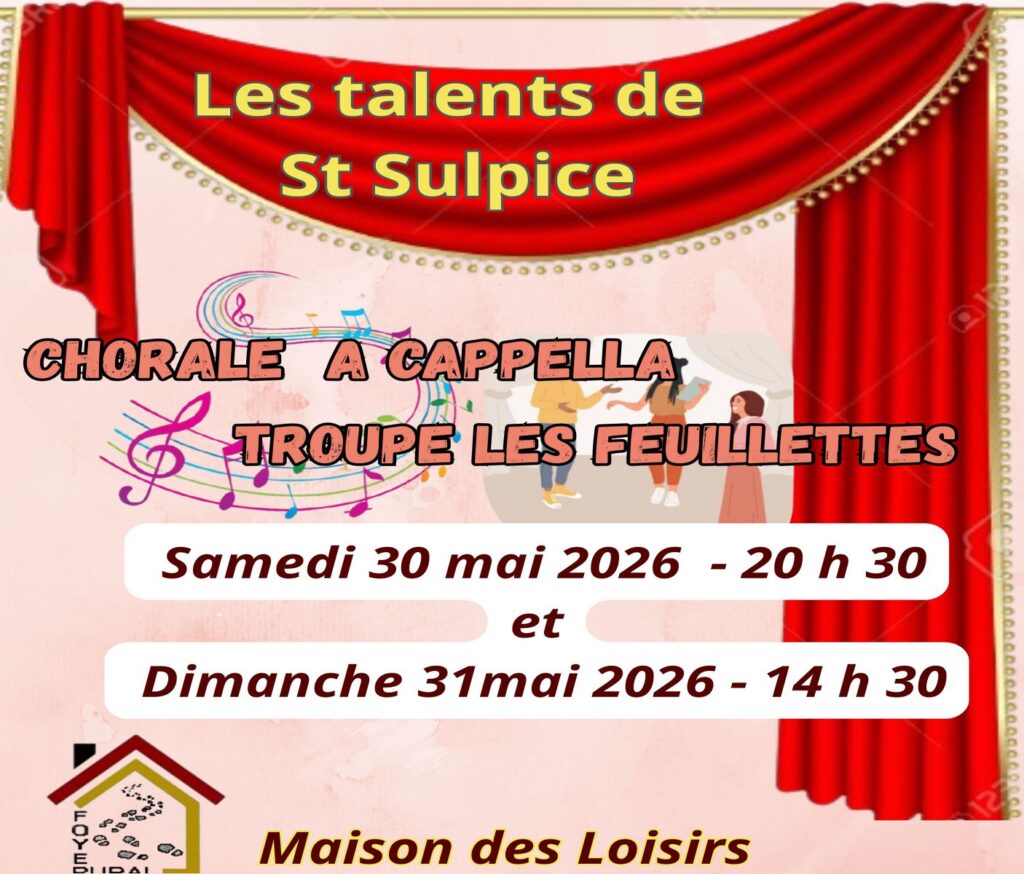 Un succès : dimanche 17 mai 2025, nous avons eu le plaisir d’accueillir à la Maison des Loisirs le spectacle mêlé du chant et du théâtre. Acappella et les Feuillettes n’ont pas loupé leur première présentation. 3 heures de ravissement, larmes de rire et d’émotion. Merci à vous, les talents de St Sulpice.